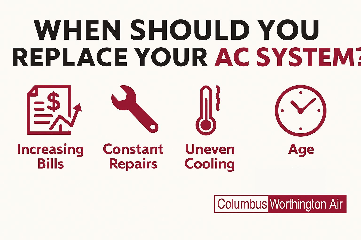 AC replacement shouldn’t be the first thing you do when you notice a problem, but it’s a good idea to know the signs that it’s time for a new air conditioner. At Columbus Worthington Air, we’re happy to evaluate your system and give reliable recommendations for whether a replacement or repair is in order. In general, you should consider air conditioning replacement in the following cases: